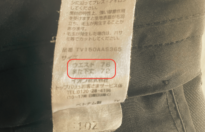 - サイズ:ウエスト〇〇/股下〇〇が大切。所有のタグを見て購入するとより失敗しない(あなたの実数値)